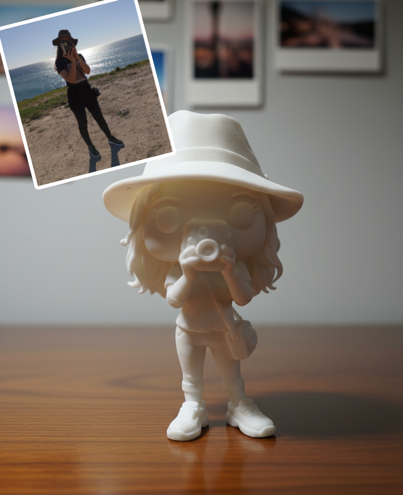 O MiniMe é um boneco personalizado impresso em 3D, criado a partir de uma foto que envias. Cada peça é única e feita especialmente para ti.